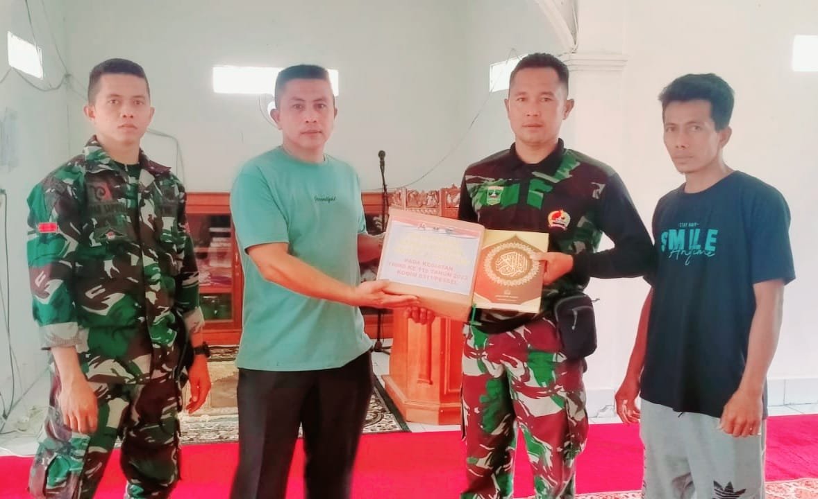 Tim satgas Tentara Manunggal Membangun Desa (TMMD) ke-115 Pesisir Selatan, menyerahkan bantuan Sarana Kontak berupa Al-Qur’an.