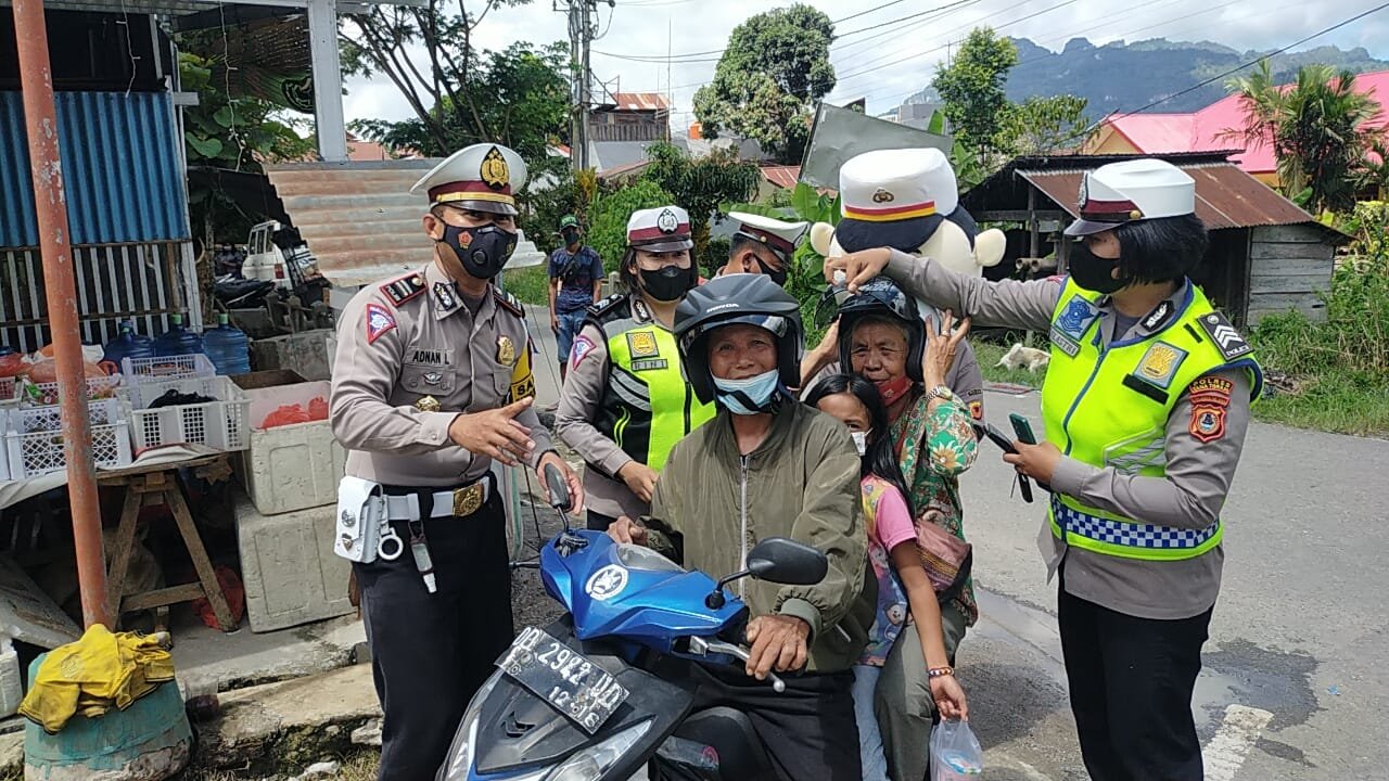 Toraja - Personil Satlantas Polres Tana Toraja (Tator) membagikan helm bagi pengendara roda dua yang sudah diatas 40 tahun dan yang tertib memakai masker kepada masyarakat pengendara di jalan masuk pasar Ge'tengan Kecamatan Mengkendek Tator, dalam Operasi Keselamatan Jaya 2022 dihari ke dua belas, Sabtu 12 Maret 2022.