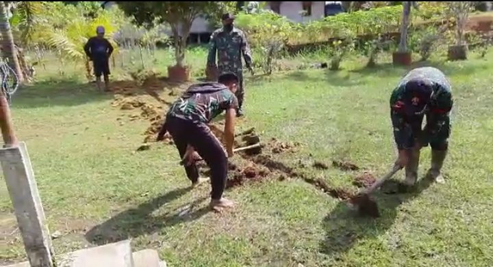 Anggota Satgas Pamtas RI-Malaysia Yonif 144/JY bantu warga pemasangan saluran pipa air di lingkungan sekolah SDN 05 Desa Seriang, Kecamatan Badau, Kabupaten Kapuas Hulu, Kalbar.
