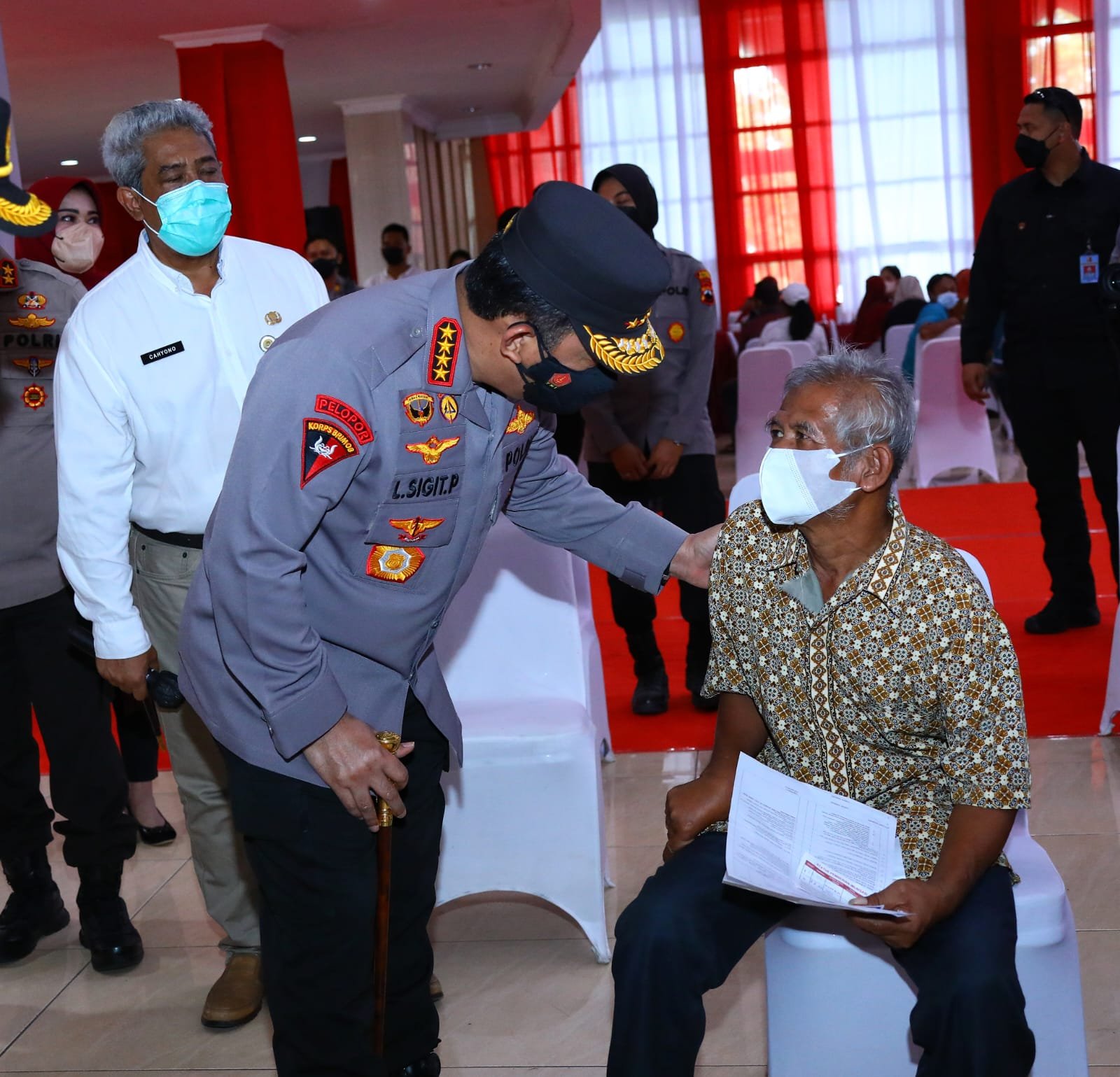 Kapolri Jenderal Listyo Sigit Prabowo meninjau akselerasi percepatan vaksinasi di 5.703 titik di 34 Provinsi Indonesia. Dalam kegiatan kali ini, Kapolri hadir secara langsung di Gedung Grand Haji Delanggu, Kabupaten Klaten, Jawa Tengah (Jateng), Sabtu (12/3/2022).