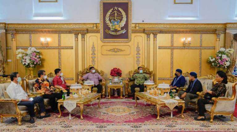 Gubernur Sulawesi Selatan (Sulsel), Andi Sudirman Sulaiman menerima kunjungan Bupati Tana Toraja, Theofilus Allorerung bersama Panitia Nasional Kongres Gerakan Mahasiswa Kristen Indonesia (GMKI) ke-38, di Rumah Jabatan Gubernur, Jalan Jenderal Sudirman, Makassar, Sabtu (12/3/2022).