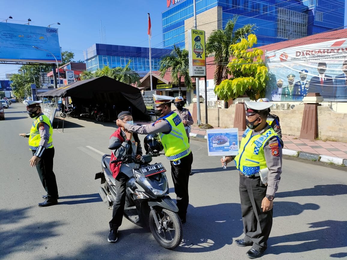 Hari ketiga, personel Operasi Keselamatan Polres Pelabuhan Makassar terus melakukan imbauan protokol kesehatan dan keselamatan berlalu lintas di jalan raya, Kamis (03/03/2022).