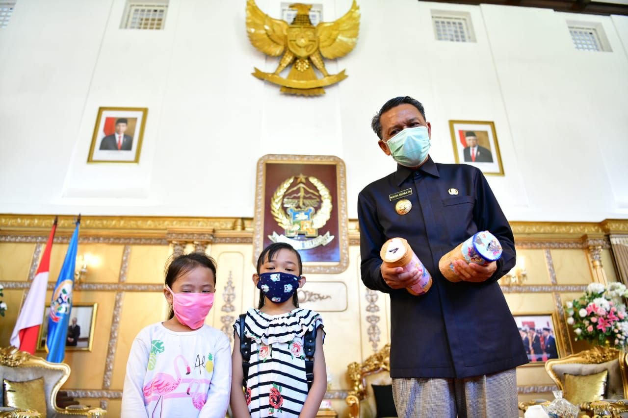 Dua orang anak asal Lamongan, Jawa Timur, menyumbangkan celengannya untuk penanganan Covid-19, yang diterima langsung Gubernur Sulawesi Selatan (Sulsel, Prof HM Nurdin Abdullah di Rujab, Senin (20/4/2020).