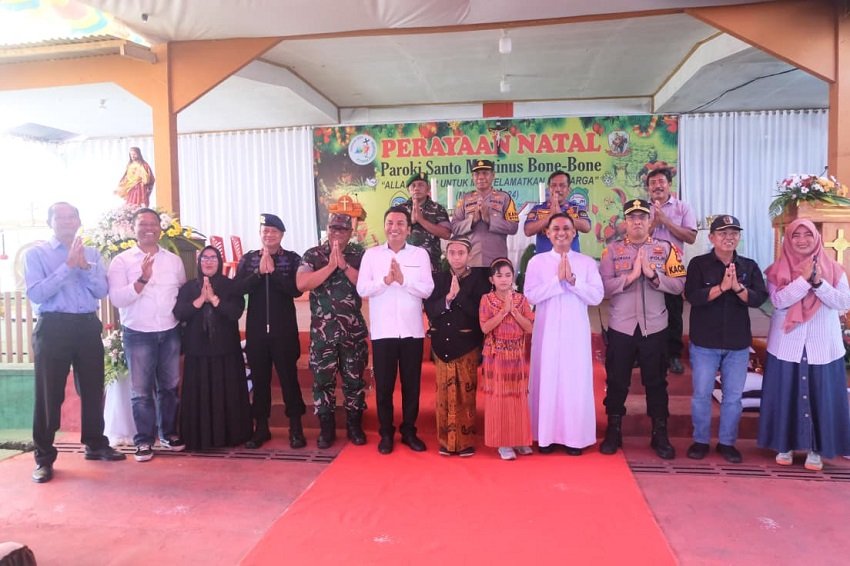 Hal tersebut disampaikan Bupati saat menghadiri perayaan Natal di Umat Paroki Santo Martinus Bone-Bone sekaligus dalam rangka pemantauan langsung pelaksanaan Natal di sejumlah gereja bersama Forum Koordinasi Pimpinan Daerah (Forkopimda), Forum Kerukunan Umat Beragama (FKUB) Kabupaten Luwu Utara, Kamis (25/12/2025).