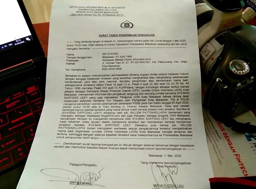 Pengurus DPD Jurnalis Online Indonesia (JOIN) Kota Makassar pada Jumat (01/05/2020) secara resmi melaporkan lelaki Willem Pattiwaellapia ke Polrestabes Makassar.