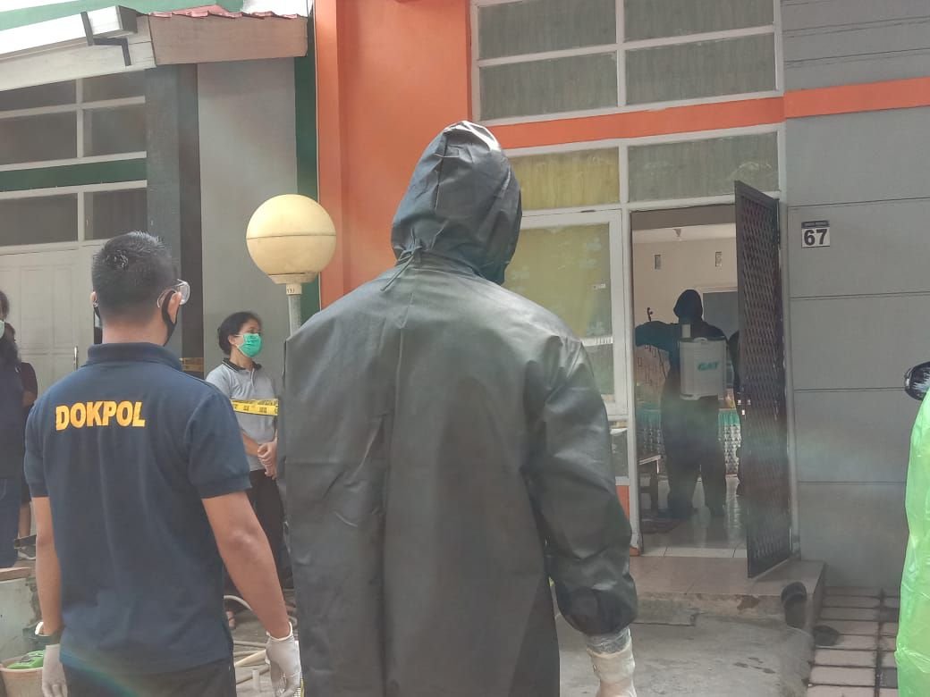 Selanjutnya melakukan sterilisasi desinfektan di TKP sebelum tim masuk ke dalam rumah di Kompleks The Green Permai No.67.