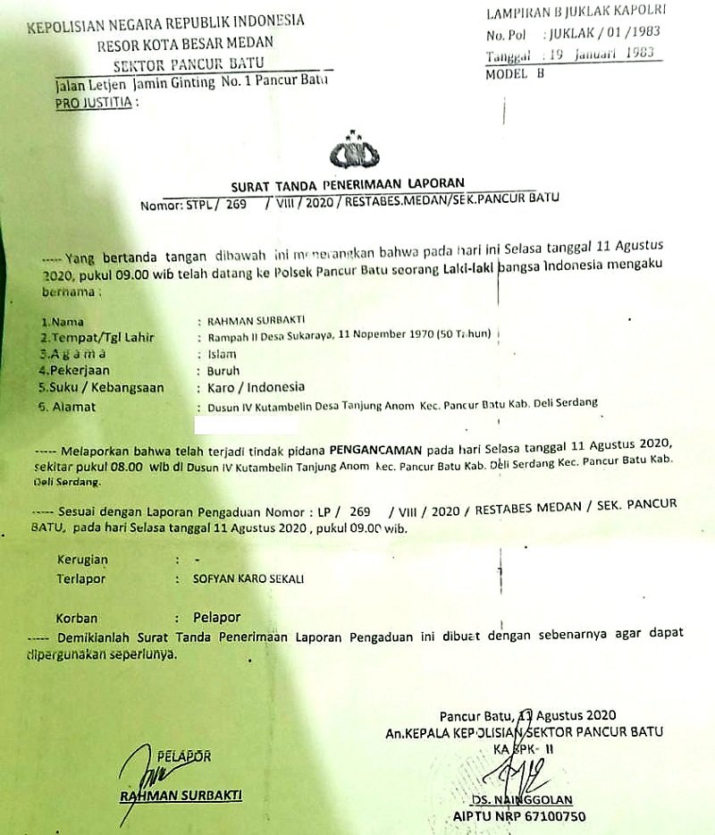 Pria pelaku penikaman tersebut dikabarkan sudah menghirup udara segar. Namun mirisnya, pria ini juga masih tersandung dengan kasus pengancaman terhadap diri Rahman Surbakti berdasarkan Laporan Polisi No : LP/269/VIII/2020/Restabes Medan/Sektor Pancur Batu.
