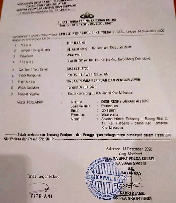 Atas laporannya dengan waktu kejadian pada tanggal 7 Juli 2020 bertempat di Kedai Kanrerong Jln R.A. Kartini, Makassar itu, Fitriani menerima Surat Tanda Terima Laporan Polisi dengan Nomor : STTLP/391/XII/2020/SPKT Polda Sulsel tanggal 14 Desember 2020 yang ditandatangani Bripka Sabri Djamil.