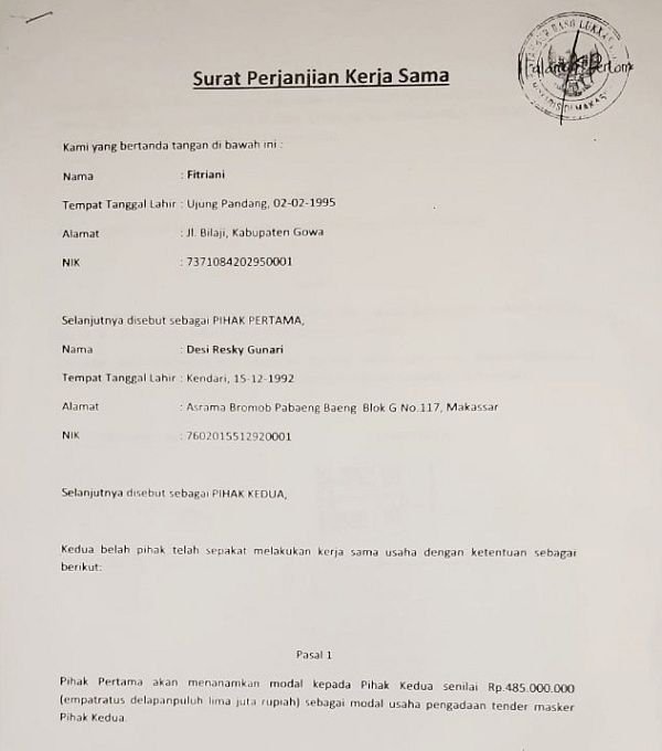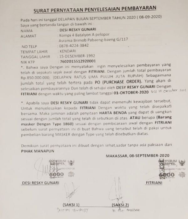 Beberapa bukti surat yang diperlihatkan Fitri di depan petugas penerima laporannya, diantaranya Surat Perjanjian Kerjasama (terkait pengadaan/pembelian masker) yang dilegalisir Notaris H. Syahbur Baso Lukkasa, SH, serta Surat Pernyataan Penyelesaian Pembayaran kepada Fitriani yang dibuat dan ditandatangani Desi Resky Gunari.