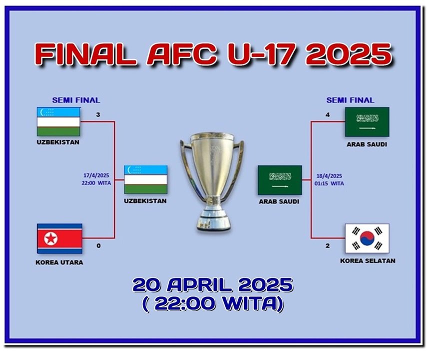 Dengan hasil ini, final Piala Asia U-17 2025 akan mempertemukan dua tim kuat yang menunjukkan performa impresif sepanjang turnamen. Arab Saudi, dengan semangat pantang menyerah dan mental baja, akan menantang Uzbekistan, tim yang tampil solid dan efektif dalam memanfaatkan keunggulan. Pertandingan final diprediksi akan berjalan menarik dan menjadi penutup yang sempurna bagi gelaran Piala Asia U-17 2025.(*Aan'82)