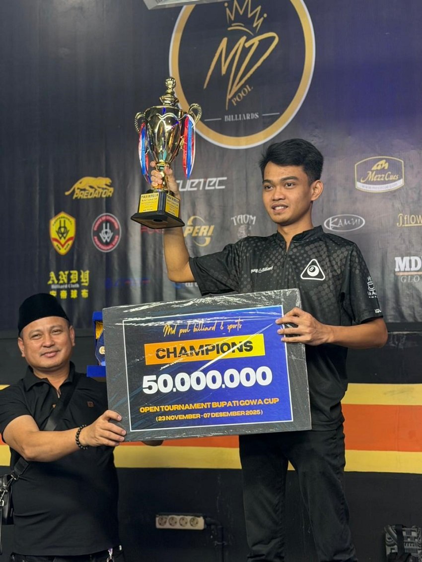 SOROTMAKASSAR – MAKASSAR, Pelatih sekaligus Ketua Pobsi Makassar, Agussalim, mengaku bangga atas pencapaian atlet binaannya, Idris Kadir, yang berhasil keluar sebagai juara pada Open Tournament Bupati Gowa Cup di MD Pool Billiard and Sport Gowa, Minggu (7/12/2025). Agussalim menilai kemenangan tersebut menjadi bukti konsistensi latihan yang selama ini dijalani sang atlet.