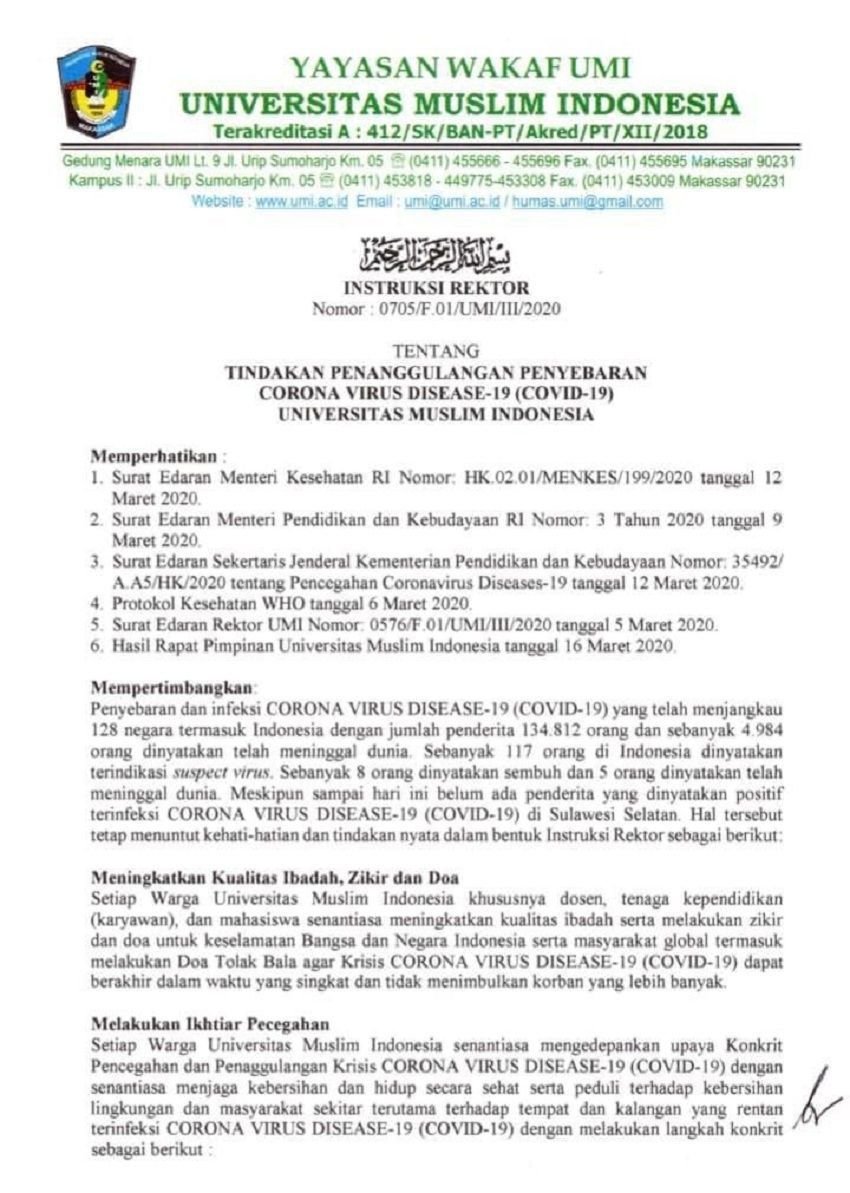 Rektor UMI Prof. DR. H. Basri Modding, SE, MSi, mengeluarkan instruksi Rektor tentang penanggulangan penyebaran coronavirus disease-19 (Covid-19) Universitas Muslim Indonesia.