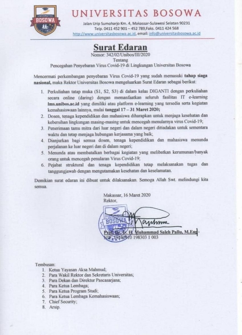 Mencermati perkembangan penyebaran virus covid-19 yang sudah memasuki tahap siaga nasional, maka Rektor Universitas Bosowa Prof. DR. Ir. H. Muhammad Saleh Pallu, MEng, mengeluarkan Surat Edaran sebagai berikut: