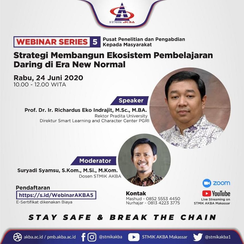 STIMIK AKBA yang Diketuai Dr. H. Askar Taliang, MSi, menggelar webinar seri 5 dengan mengusing tema, Strategi Membangun Ekosistem Pembelajaran Daring di Era New Normal. Webinar ini akan dilaksanakan Rabu 24 Juni 2020 mulai pada pukul 10.00-12.00 WIT.