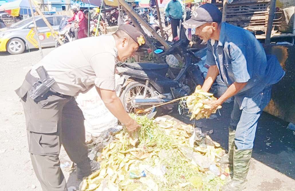 Dengan kesigapannya melihat pedagang beraktivitas, Aiptu Murtala Kadir turut membantu untuk mengangkat tumpukan sampah tersebut agar terlihat bersih diwilayah pasar yang dimaksud.