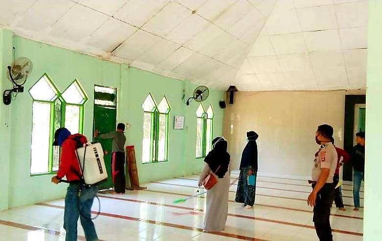 Bhabinkamtimmas memberikan himbauan dan pesan-pesan Kamtibmas, agar tetap bersama-sama mencegah virus Corona, melaksanakan penyemprotan ditiap-tiap masjid dan dirumah masing-masing.
