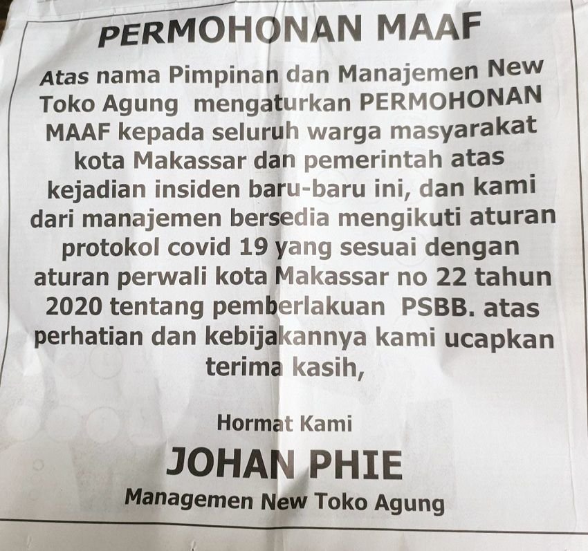 Diungkapkan oleh Mulawarman, kalau 3 hari lalu manajemen Toko New Agung meminta maaf lewat iklan di media cetak dan berjanji akan patuh dan taat aturan PSBB Kota Makassar. Tetapi nyatanya Agung tetap buka. Artinya permintaan maaf dan janjinya yang disampaikan lewat iklan di media cetak Tribun dan Fajar itu, hanya untuk mengejek masyarakat atau pemerintah Kota Makassar.