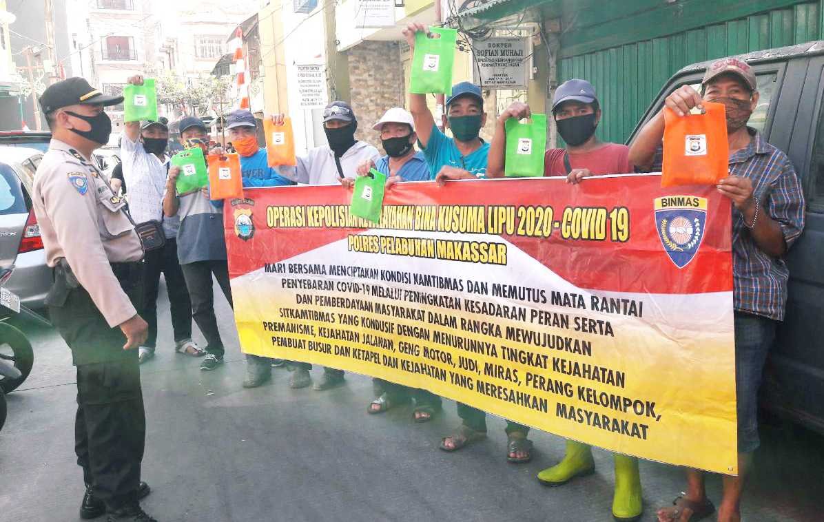 Satgas Operasi Bina Kusuma 2020 Polres Pelabuhan Makassar melaksanakan kegiatan penyuluhan, imbauan dan edukasi protokol kesehatan serta membagikan masker kepada masyarakat, Selasa (18/08/2020).