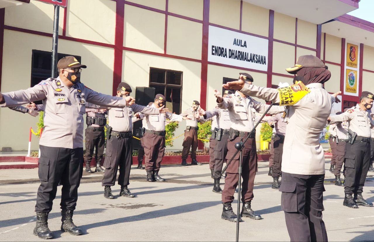 Dalam rangka menjaga kebugaran tubuh untuk mendukung aktivitas pelaksanaan tugas, personel Polres Gowa usai melaksanakan apel pagi melaksanakan senam olahraga ringan dengan melakukan gerakan perenggangan otot atau Stretching, Jumat (23/10/2020).