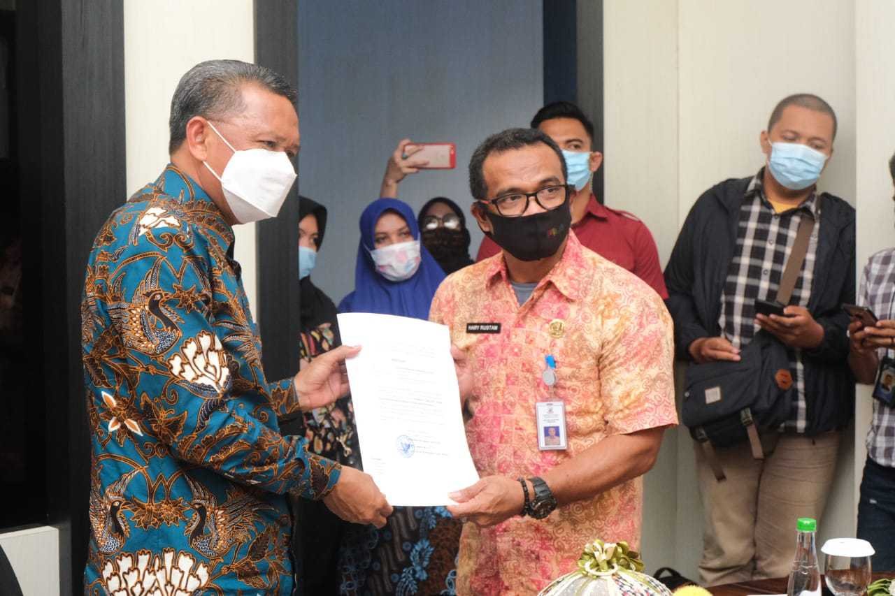 Gubernur Sulawesi Selatan (Sulsel), Prof HM Nurdin Abdullah, menyerahkan surat keputusan terkait penetapan Pelaksana Tugas (Plt) kepala dinas untuk Dinas Peternakan dan Kesehatan Hewan (Keswan) Sulsel serta Dinas Kelautan dan Perikanan Sulsel, Kamis (5/11/2020).