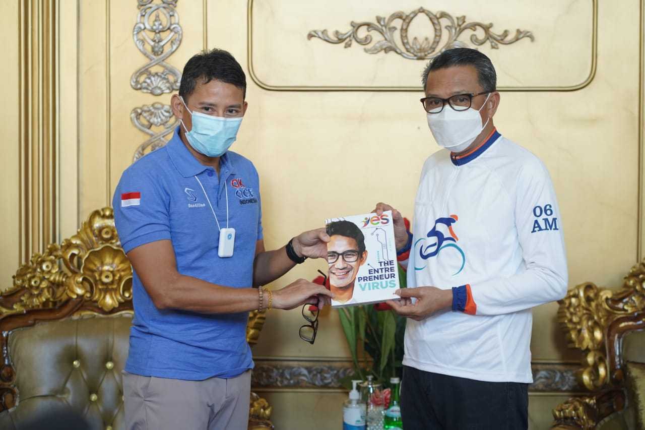Gubernur Sulawesi Selatan (Sulsel), Prof HM Nurdin Abdullah, menyambut kedatangan tokoh nasional Sandiaga Uno, di Rumah Jabatan Gubernur, Minggu (29/11/2020) pagi.