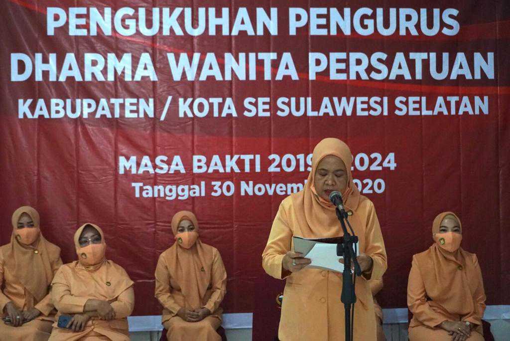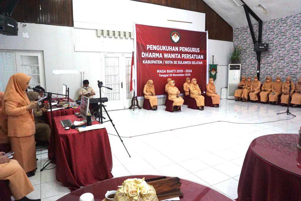 Pengurus Dharma Wanita Persatuan (DWP) Unit Kerja Provinsi Sulawesi Selatan (Sulsel) dan Kabupaten/Kota se Sulsel Masa Bakti 2019-2024, resmi dikukuhkan, Senin (30/11/2020).