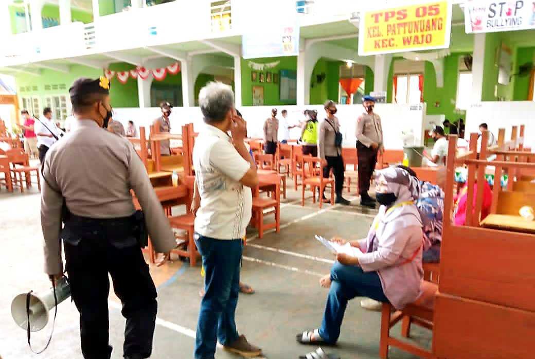 "Imbauan disampaikan oleh petugas dengan membawa megaphone dan meminta agar semua warga menjaga jarak, memakai masker serta cuci tangan menggunakan sabun pada saat mau dan sesudah menentukan hak suaranya," jelas Paur Subbag Humas Ipda Burhanuddin Karim.