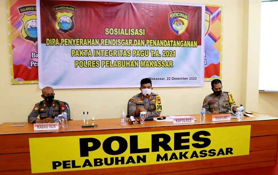 "Sosialisasi DIPA penyerahan Rendisgar dan Penandatanganan Pakta Intergritas Pagu TA 2021 jajaran Polres Pelabuhan Makassar ini merupakan dokumen pelaksanaan anggaran yang berfungsi sebagai dasar pelaksanaan kegiatan dan penggunaan anggaran dalam kurun waktu satu tahun," terang Kapolres AKBP Kadarislam.