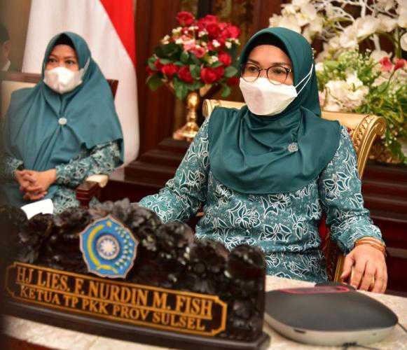 Ketua Tim Penggerak PKK Sulsel, Lies F Nurdin, mengikuti Sosialisasi Vaksinasi Covid-19 Bagi TP PKK dan BPMD Wilayah Kalimantan dan Sulawesi, Rabu (10/2/2021).