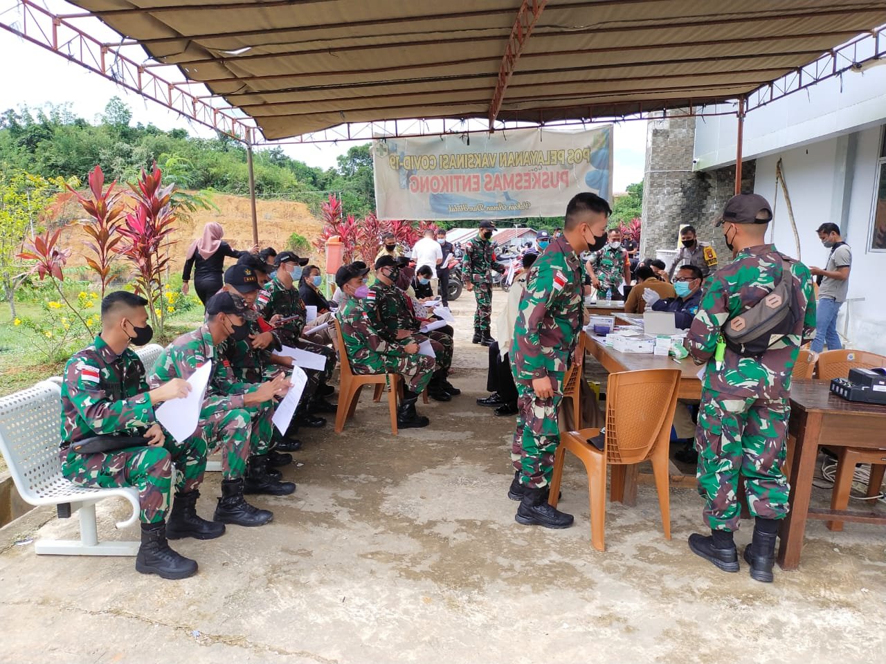 Sebanyak 50 personel pos Kotis Satgas Pamtas Yonif Mekanis 643/Wns melaksanakan program Pemerintah berupa vaksinasi booster jenis AstraZeneca bertempat di Puskesmas Entikong Desa Entikong, Kecamatan Entikong, Kabupaten Sanggau.