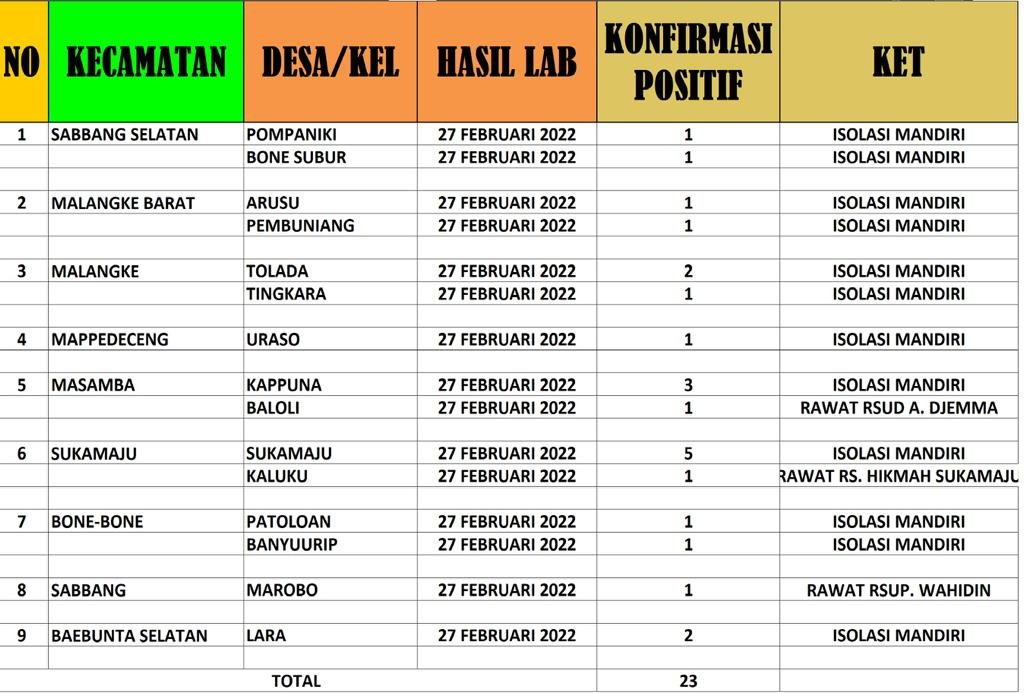 Komang panggilan akrabnya yang juga Kepala Bidang Pencegahan dan Pengendalian Penyakit pada Dinas Kesehatan Luwu Utara mengatakan bahwa, tambahan pasien positif Corona tersebut berasal dari Kecamatan Sabbang Selatan masing-masing 1 (satu) orang ari Desa Pompaniki dan Bone Subur.