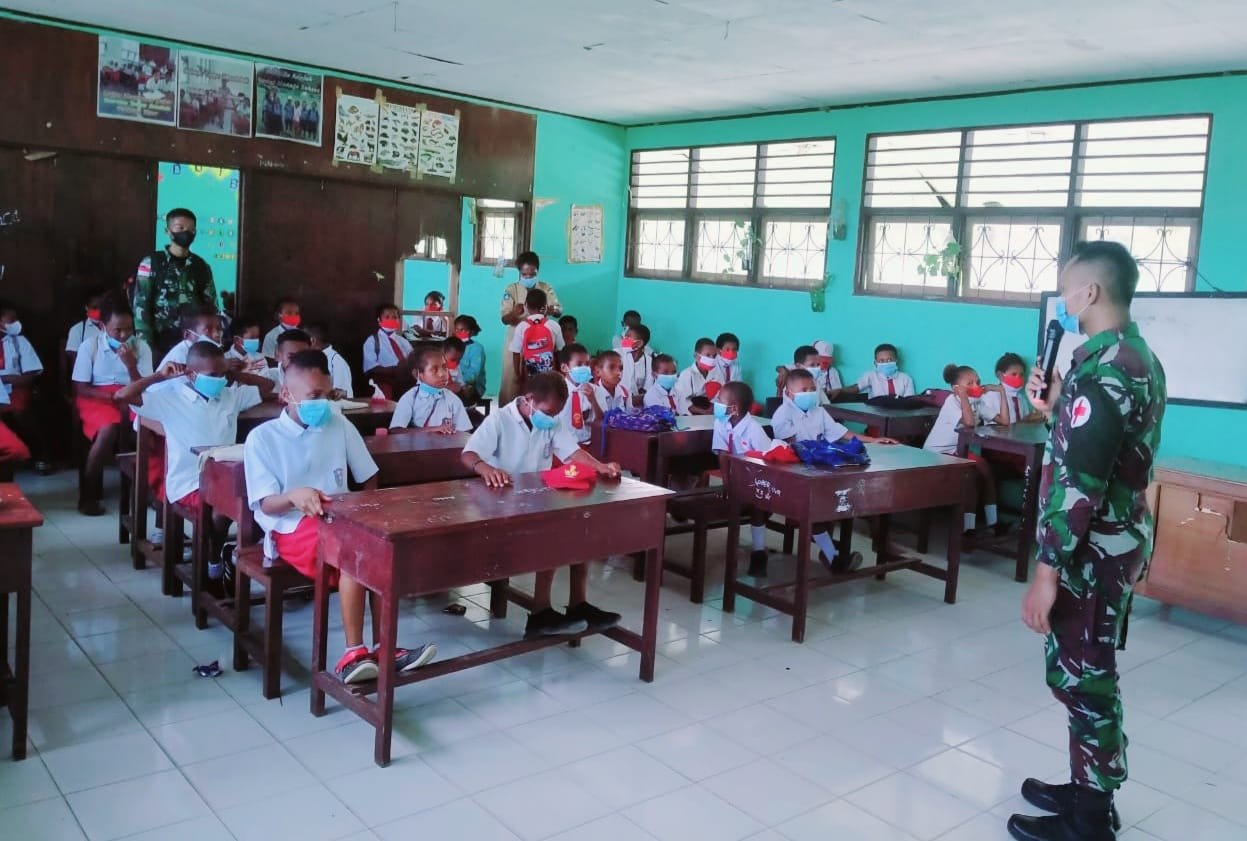 Satgas Pamtas RI-PNG Yonif 711/Rks Pos Arso Kota memberikan pembekalan ilmu kesehatan kepada siswa SD Inpres Kwimi Kampung Arso, Distrik Arso Kota, Kabupaten Keerom, Papua, Kamis (03/03/2022).