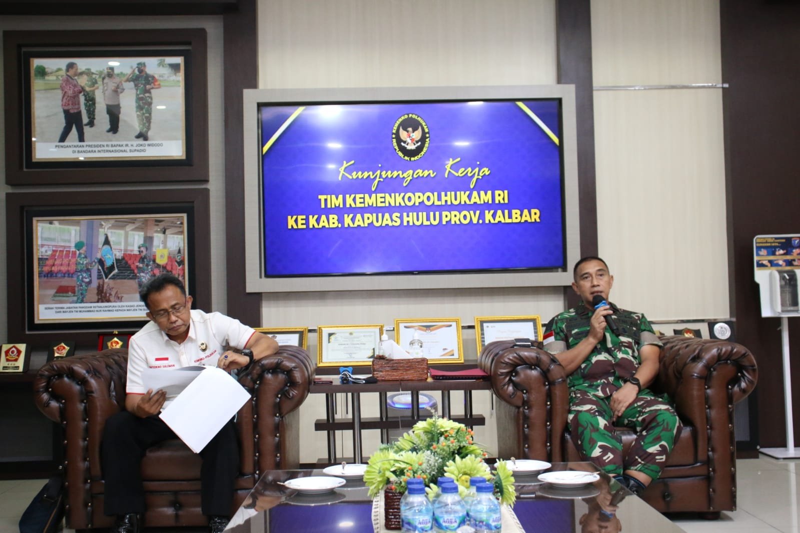Panglima Kodam XII/Tanjungpura (Tpr), Mayjen TNI Sulaiman Agusto, SIP, MM yang diwakili oleh Kapoksahli Pangdam XII/Tpr, Brigjen TNI Handoko Nurseta, SH, M.Tr (Han) menerima kunjungan tim dari Kementerian Koordinator Bidang Politik, Hukum dan Keamanan Republik Indonesia bertempat di ruang koridor gedung A Makodam XII/Tpr.