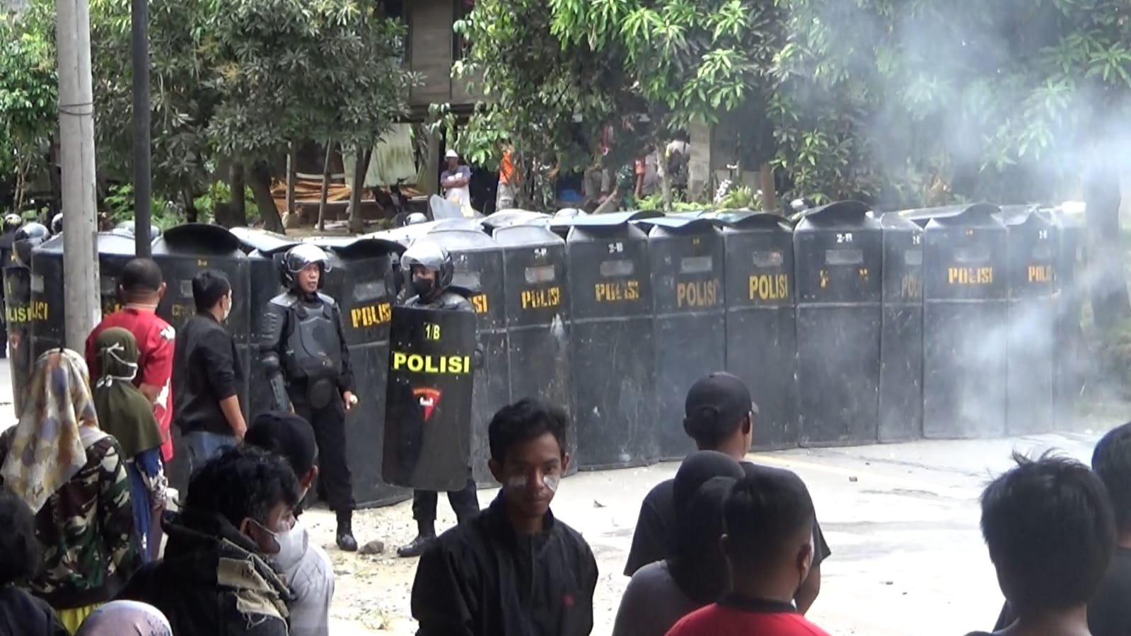 Petugas berusaha membubarkan aksi blokade jalan, namun dibalas lemparan batu. Petugaspun membalas dengan tembakan gas air mata. Bentrokan warga dengan Brimob akhirnya tak terhindarkan.
