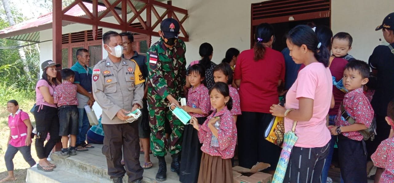 Anggota Satgas Pamtas RI-Malaysia Yonif 144/JY bersinergi bersama Polri bagikan masker di depan kantor balai Desa Nanga Bayan, Kecamatan Ketungau Hulu, Kabupaten Sintang, Kalbar.