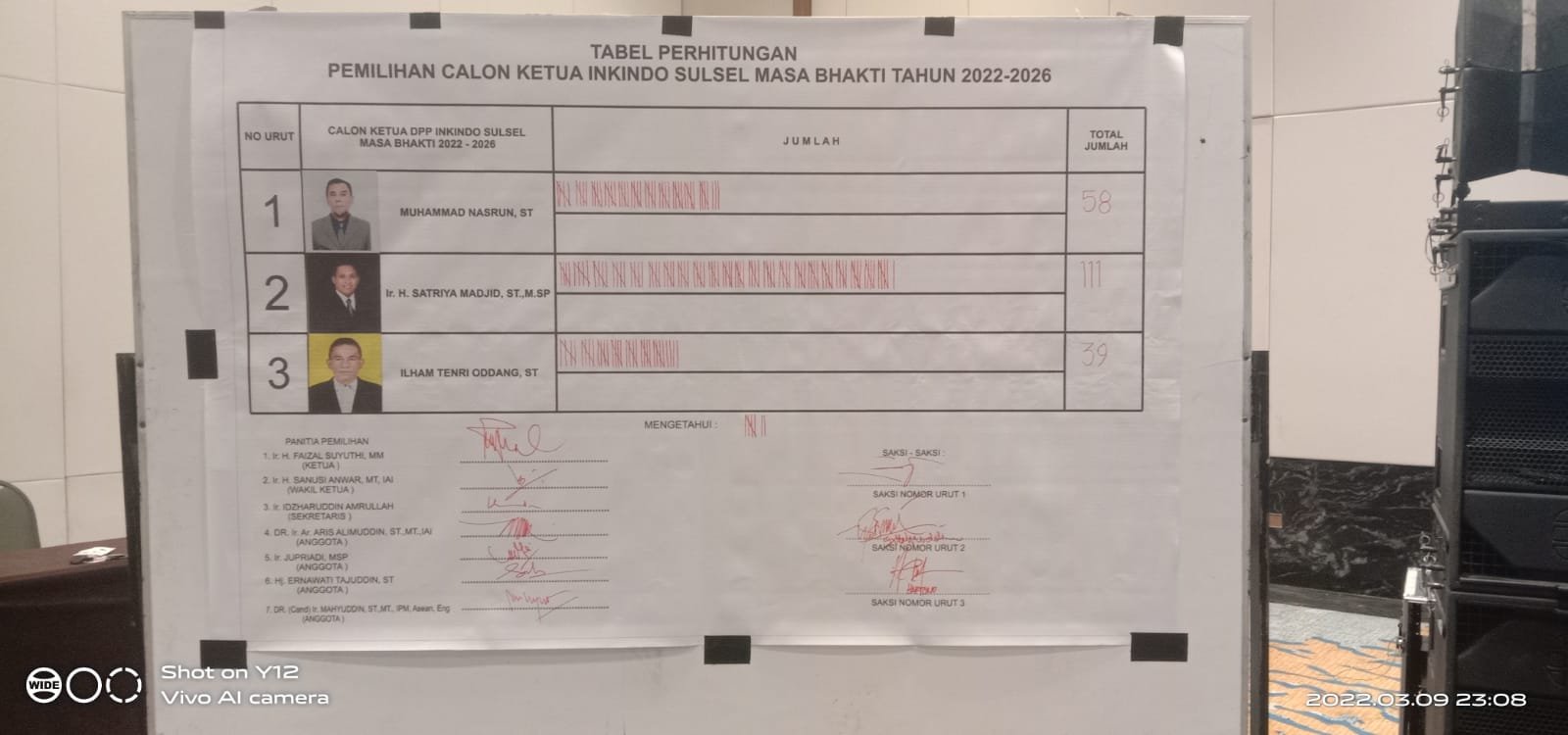 Dalam penghitungan tersebut, Incumben Ketua INKINDO Sulsel, Ir. H. Satriya Madjid memperoleh suara 111 dan berhak untuk memimpin organisasi ini periode 2022 hingga 2026. H. Satriya mengungguli pesaingnya, M. Nasrun dan Ilham Tenri Oddang yang hanya memperoleh masing-masing 58 dan 39 suara.