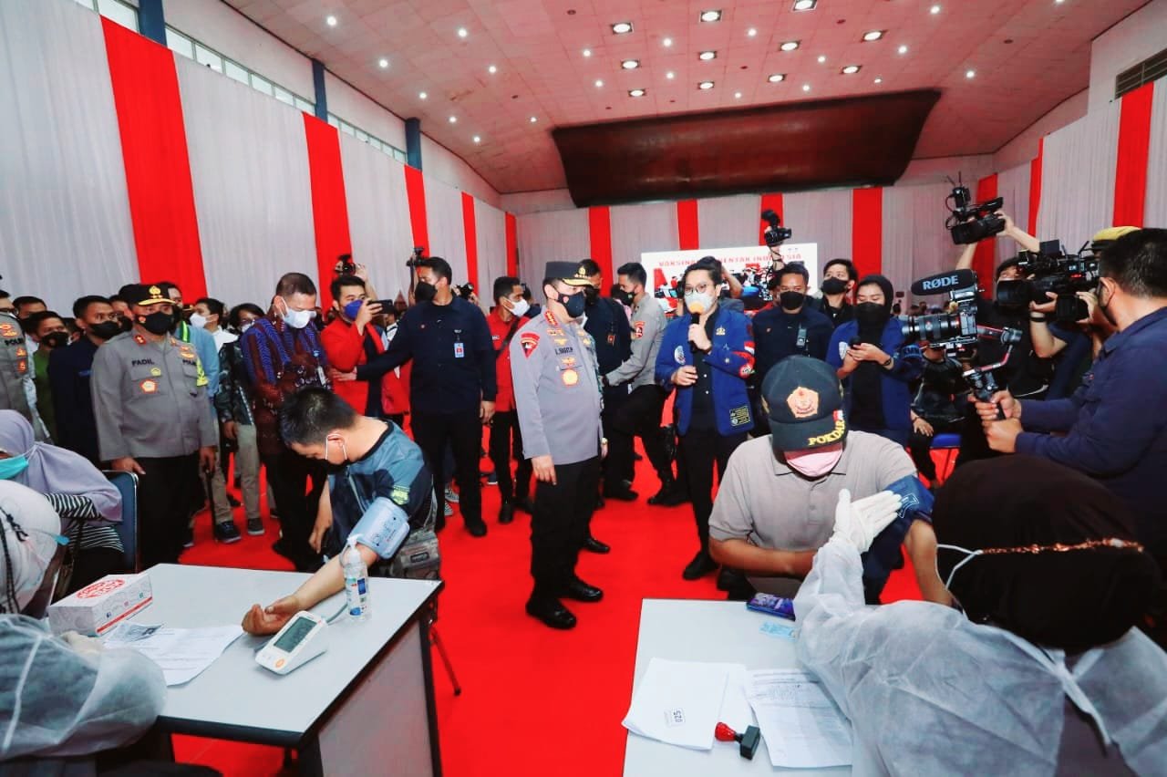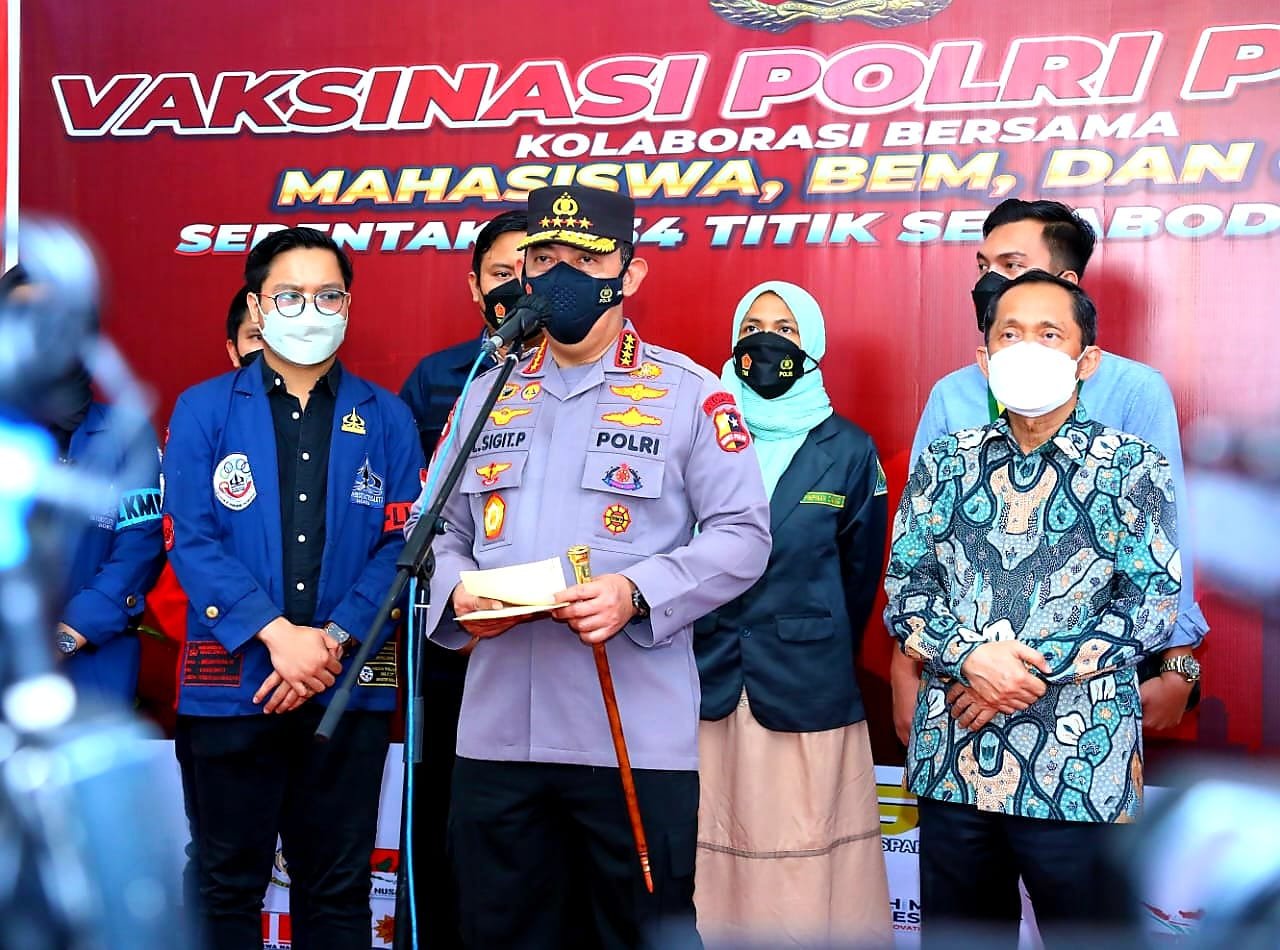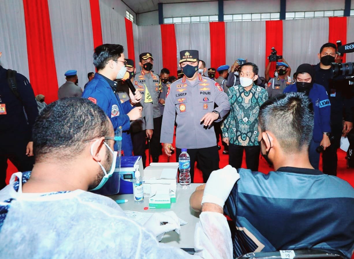 Kapolri Jenderal Listyo Sigit Prabowo meninjau secara langsung kegiatan akselerasi vaksinasi yang diselenggarakan bersama dengan elemen mahasiswa, BEM dan Organisasi Kepemudaan (OKP) di Gelanggang Olahraga Universitas Trisakti, Jakarta, Selasa (29/03/2022).