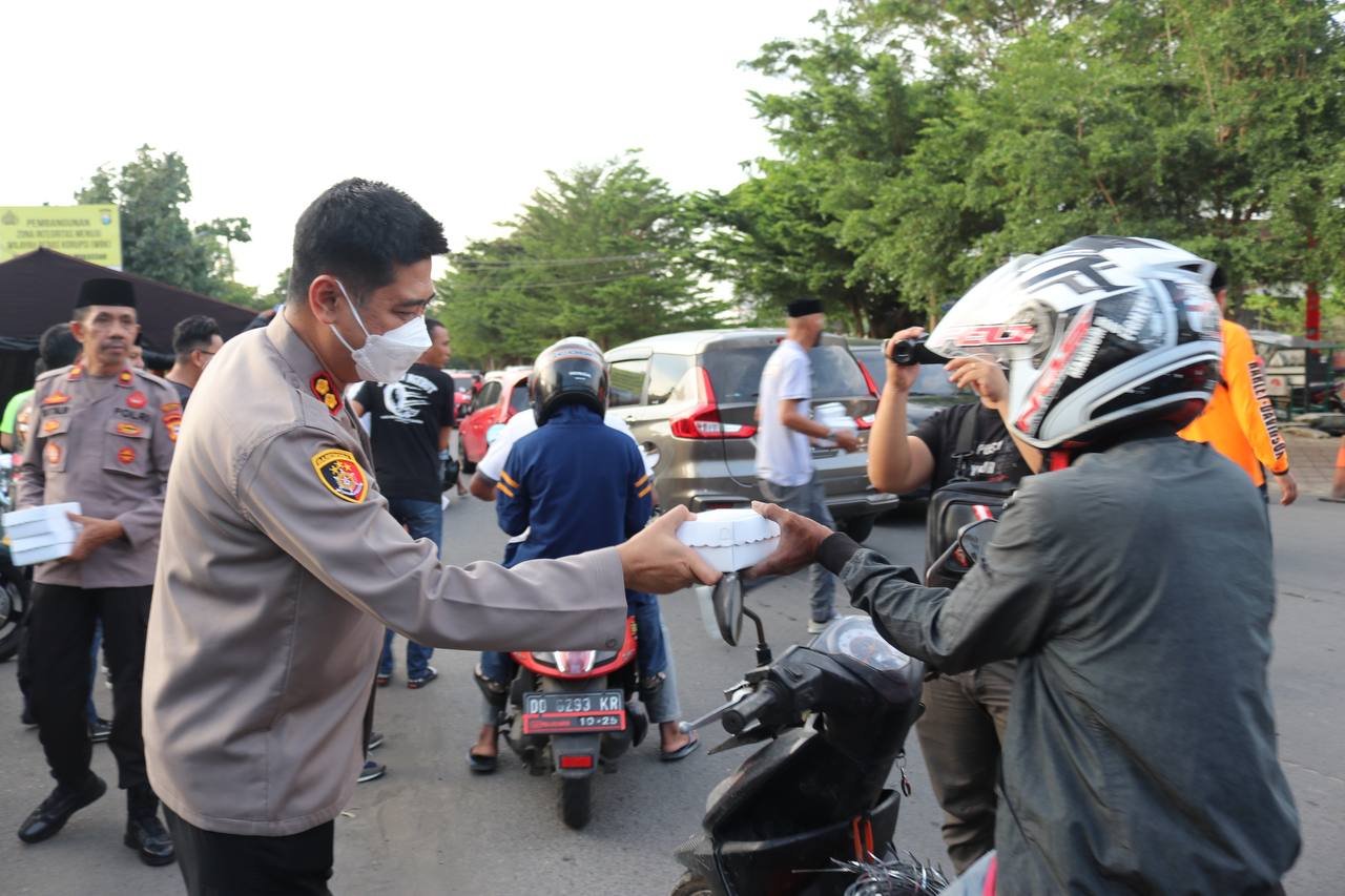 Kapolres Pelabuhan Makassar AKBP Yudi Frianto SIK, MH bersama personelnya membagikan takjil kepada pengguna jalan, Sabtu (23/04/2022).
