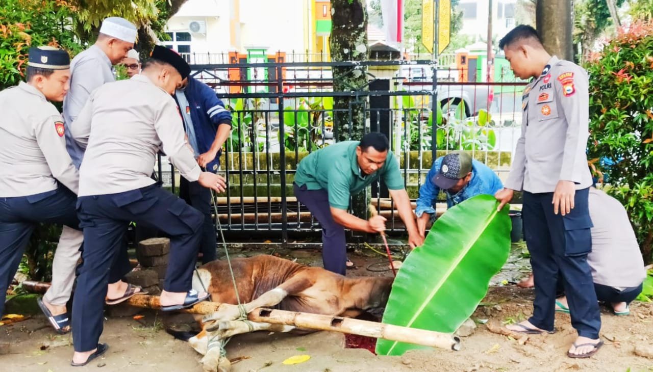 Penyembelihan hewan qurban disaksikan Kapolres Eko Suroso dan istri, Wakapolres, para Pejabat Utama, personel serta para anggota Bhayangkari PC Torut.