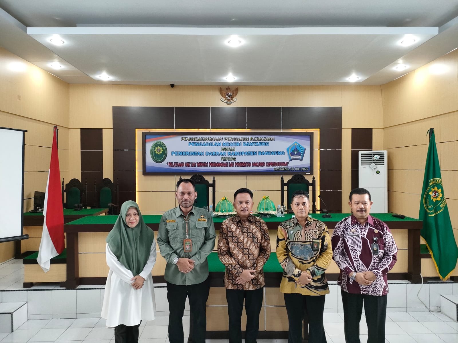 Pemkab Bantaeng bersama Pengadilan Negeri (PN) Bantaeng melakukan penandatanganan kerjasama Pelayanan One Day Service Permohonan dan Penerbitan Dokumen Kependudukan di Kantor Pengadilan Negeri Bantaeng, Kecamatan Bantaeng, Kamis (28/07/2022).