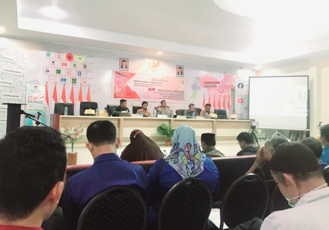 Kapolres Gowa AKBP Tri Goffarudin P, SIK, MH menghadiri kegiatan Sosialisasi Peraturan Komisi Pemilihan Umum (PKPU) Kabupaten Gowa yang digelar di Aula Media Centre Kantor KPU Gowa, Senin (01/08/2022).
