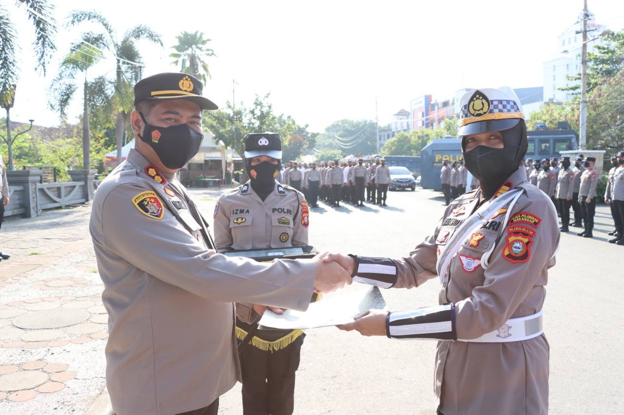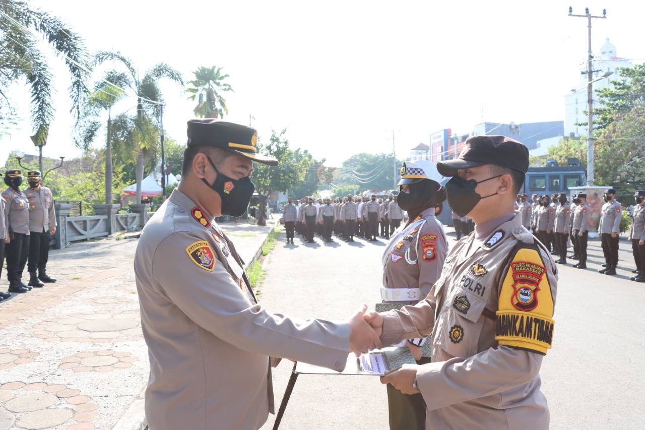 Kepala Kepolisian Resor Pelabuhan Makassar AKBP Yudi Frianto SIK, MH memberikan penghargaan kepada personelnya yang berprestasi, Senin (26/09/2022).