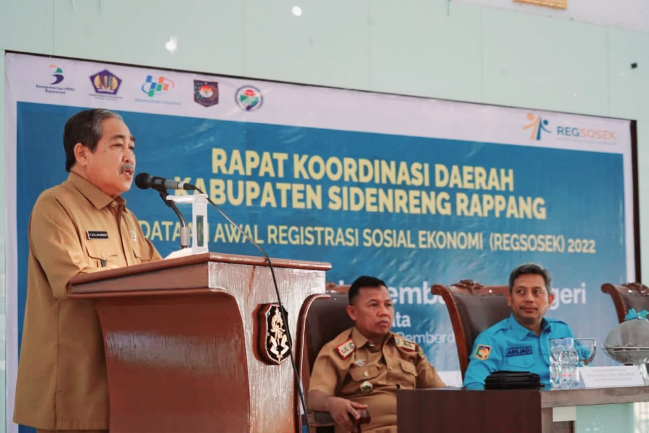 Bupati Sidrap, H. Dollah Mando menghadiri sekaligus membuka Rapat Koordinasi Daerah Pendataan Awal Registrasi Sosial Ekonomi (Regsosek) 2022 Badan Pusat Statistik (BPS), Selasa 27 September 2022.
