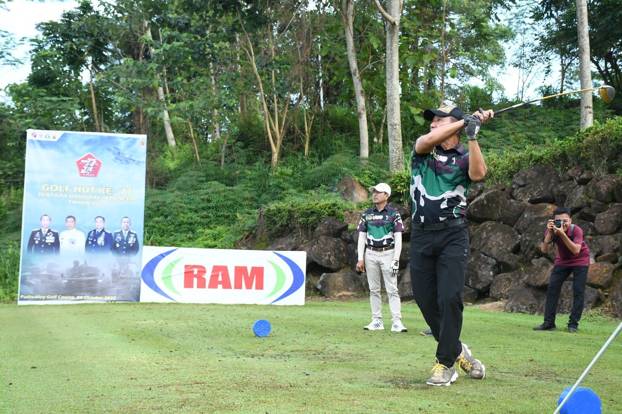 Pangdam XIV/Hasanuddin Dr. Totok Imam Santoso, SIP, S.Sos, M.Tr(Han) membuka penyelenggaraan pertandingan Golf Sosial dalam rangka Hari Ulang Tahun (HUT) TNI ke-77 yang diselengarakan di Padivalley Golf Club Jl. Pattalassang, Kecamatan Pallantikang, Kabupaten Gowa, Sabtu (08/10/2022).