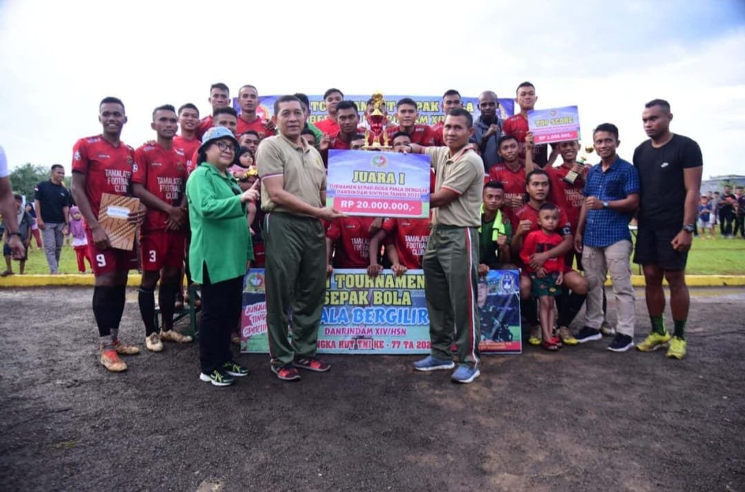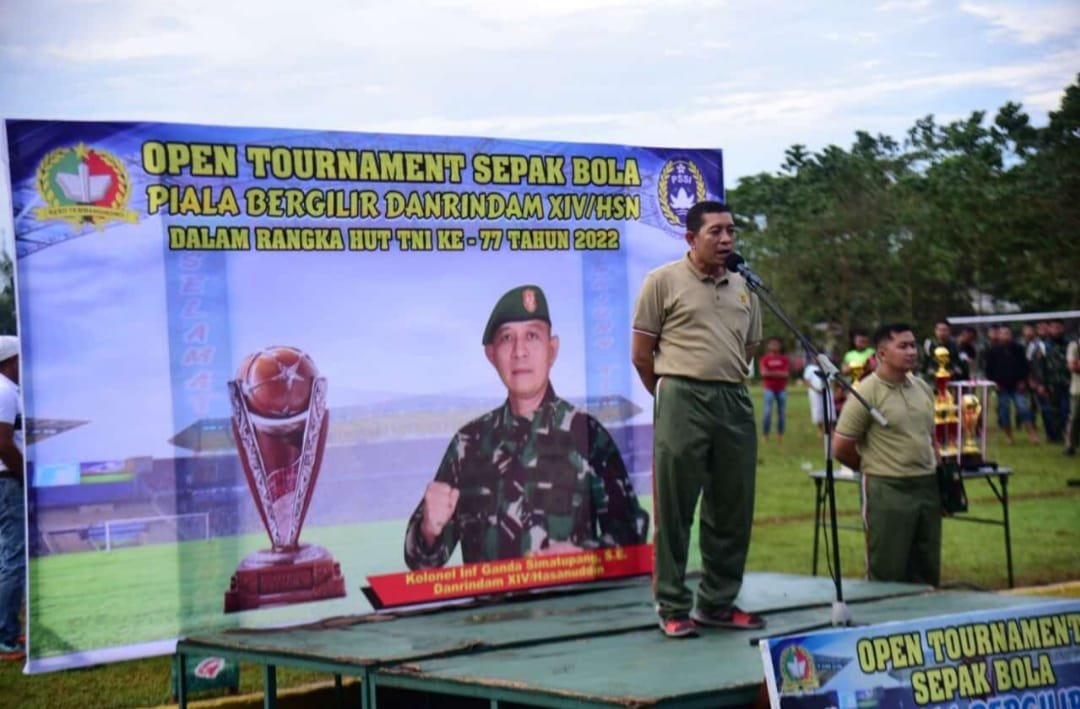 Danrindam XIV/Hasanuddin, Kolonel Inf Ganda Simatupang, SE secara resmi menutup open turnamen sepak bola piala bergilir Danrindam XIV/Hasanuddin TA 2002, dalam rangka memeriahkan HUT ke-77 TNI di lapangan sepak bola Jenderal A.H Nasution, Kabupaten Gowa, Sulawesi Selatan, Jumat (14/10/2022).
