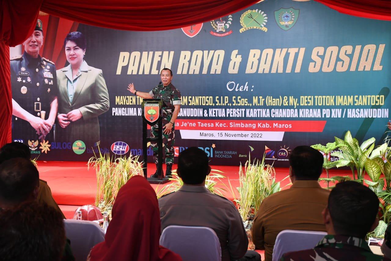 Pangdam XIV/Hasanuddin Mayjen TNI Dr. Totok Imam Santoso, SIP, S.Sos, M.Tr (Han) beserta Forkopimda Pemprov Sulsel, para Walikota dan Bupati se-Sulsel, jajaran Perbankan, tokoh masyarakat, Bulog, Gapoktan, para Pimpinan Redaksi Media serta Persit melaksanakan kegiatan Panen Raya dan Bakti Sosial yang bertempat di Desa Je’ne Taesa, Kecamatan Simbang, Kabupaten Maros, Selasa (15/11/2022).
