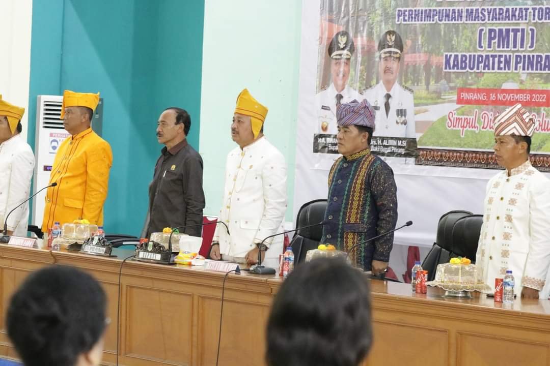 Bupati Pinrang Irwan Hamid, menyampaikan ucapan selamat kepada Pengurus Daerah Perhimpunan Masyarakat Toraja Indonesia (PMTI) Pinrang yang telah dilantik oleh Mayjen (Purn) Yulius Selvanus Lumbaa, Ketua Umum PMTI Pusat di Ruang Pola Kantor Bupati Pinrang, Rabu (16/11/2022).