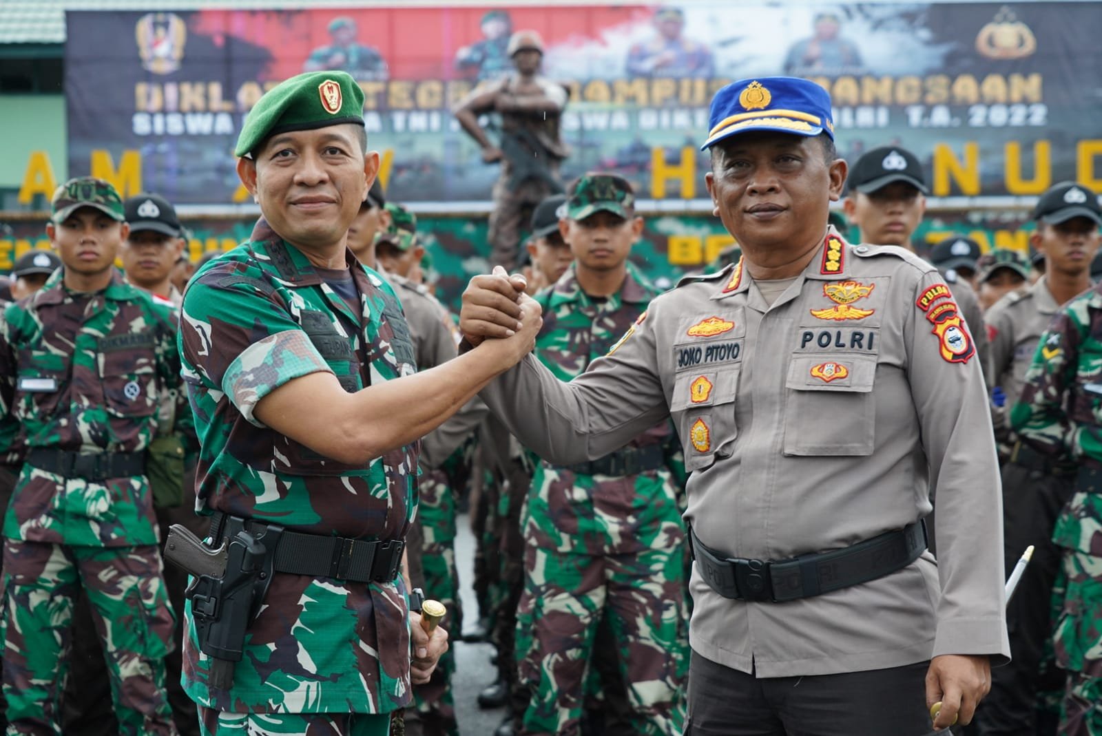 Danrindam XIV/Hasanuddin Kolonel Inf Ganda Simatupang, SE bersama Kepala Sekolah Polisi Negara (SPN) Batua Polda Sulawesi Selatan Kombes Pol Joko Pitoyo, S.Sos bertindak sebagai Inspektur Upacara (Irup) Penutupan Pendidikan dan Latihan Kolaborasi Integrasi Dikmaba TNI AD dengan Diktukba Polri TA 2022, bertempat di Mako Rindam XIV/Hasanuddin, Kabupaten Gowa, Jumat (16/12/2022).
