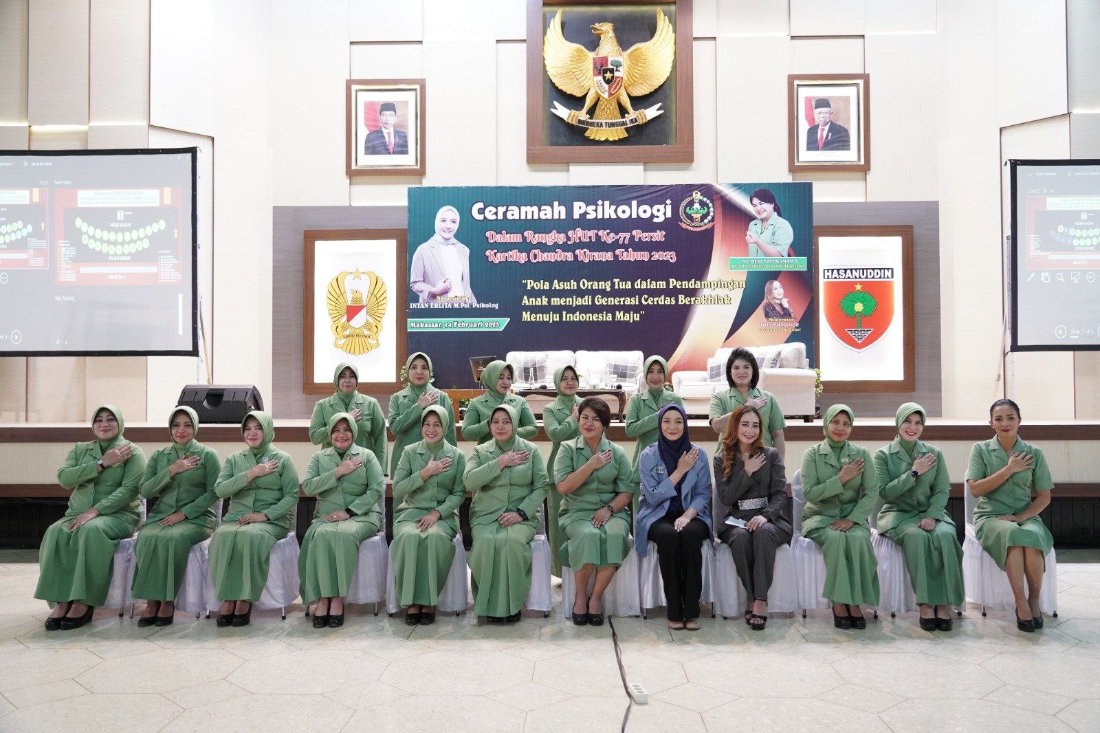 Ketua Persit Kartika Chandra Kirana (KCK) PD XIV/Hasanuddin Ny. Desi Totok Imam beserta pengurus, mengikuti pertemuan gabungan dan ceramah Psikologi dalam rangka HUT ke-77 Persit Kartika Chandra Kirana Tahun 2023, bertempat di Balai Prajurit Jend. M. Yusuf, Kota Makassar, Selasa (14/02/2023).