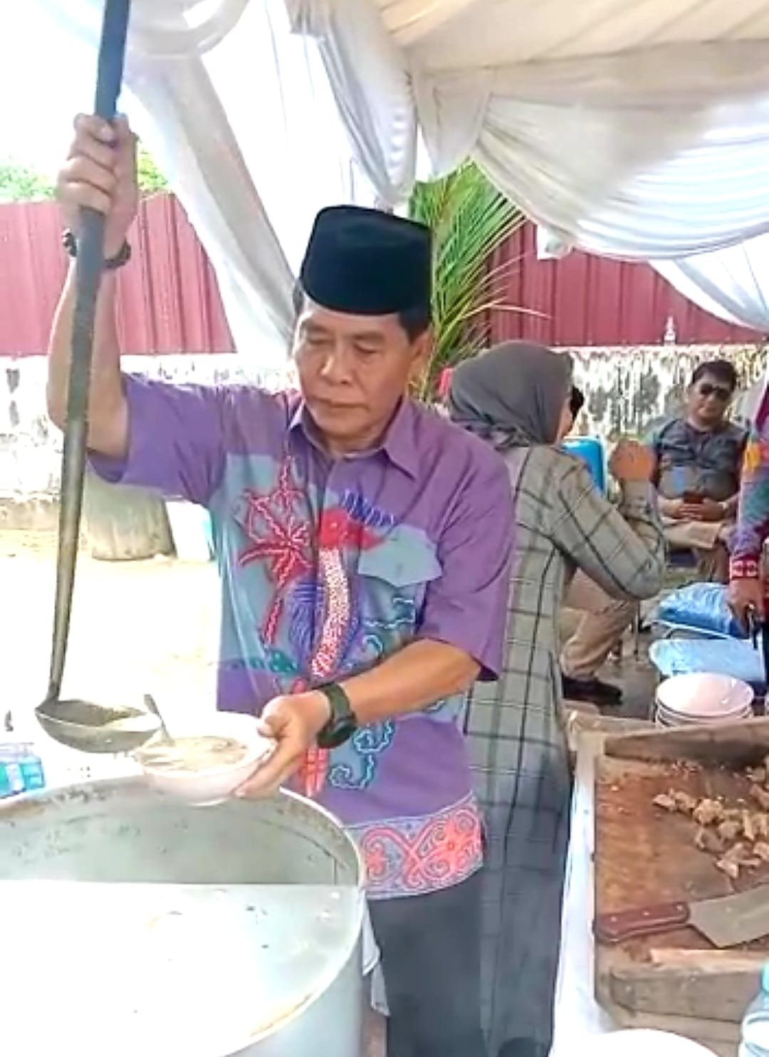 Usai meramu semangkuk Coto Makassar, mantan Wakapolda Kaltara ini lalu menyerahkan kepada tamunya yang sudah berdiri dihadapannya, lalu melanjutkan meracik mangkuk-mangkuk berikutnya buat melayani antrian panjang tamunya yang sangat ingin mencucipi kuliner andalan Kota Makassar tersebut.